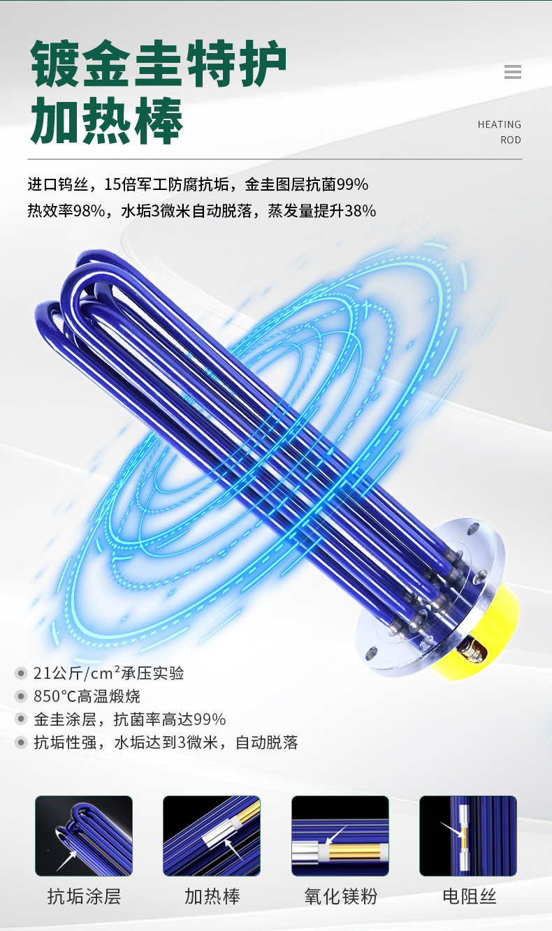 材 質:鍍金圭特護加熱棒、進口鎢絲:15倍軍工防腐抗垢·金圭涂層抗菌99%